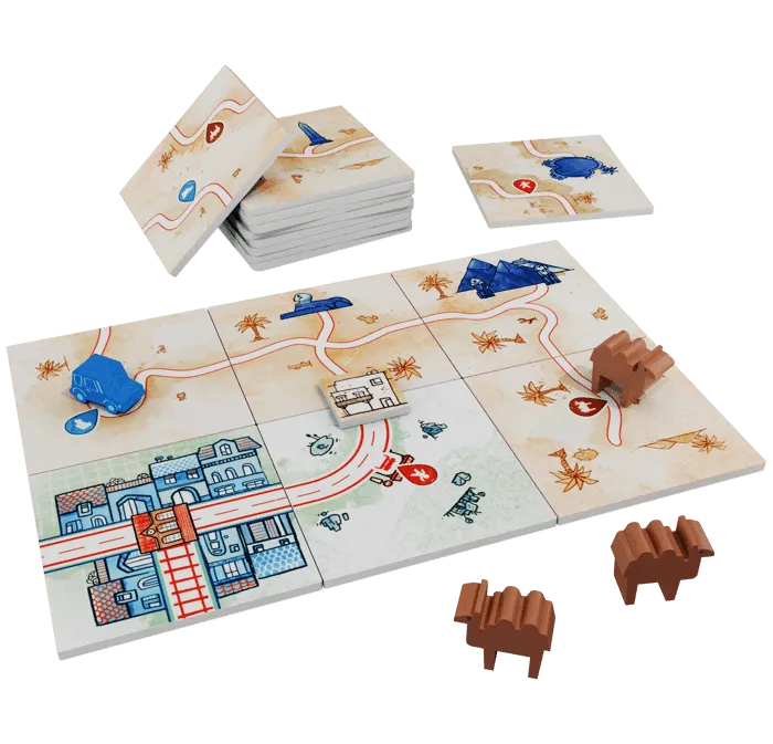 Desert tiles feature regular Car and Traveler pin points, but they lack Train pin points. In their place, they feature Camel pin points. You can use a Train Placement token to place a Camel on such a pin point, instead of placing a Train pawn. Desert tiles also feature Desert Trails: these are special routes that can be connected to both Highways and Railways: when you do, you place a Desert Station on the joining point token to mark the connection. Desert Stations are important for the scoring of both Desert Attractions and Camels.