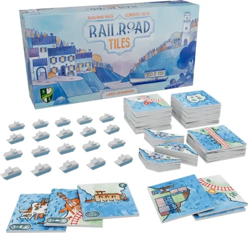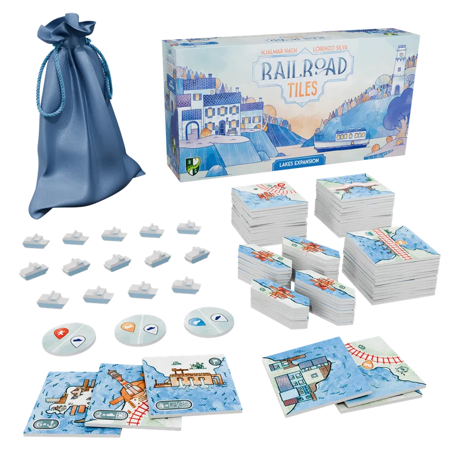 Your goal is to build Lakes and place Ferries in them to score points. Lakes also have another purpose: you can send a route into the lake side of a tile to create a Harbor (a bit like Canal End tokens work in the Canals Expansion), and all routes that are connected to the same Lake via Harbors are also connected to each other... basically, Lakes act as big Stations!