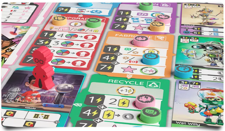 In Raising Robots, you are a famous inventor seeking to assemble the greatest collection of robots. Each round, you simultaneously choose and perform two or more actions: upgrade, assemble, design, fabricate, recycle. Every action will be performed with a variable amount of power to make the action better or worse. However, the most powerful actions will also help your opponents.