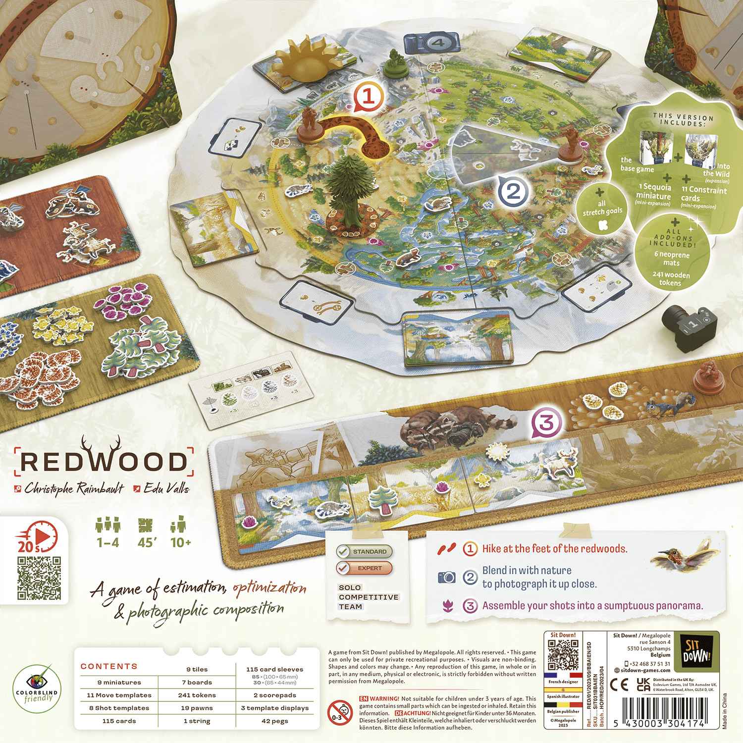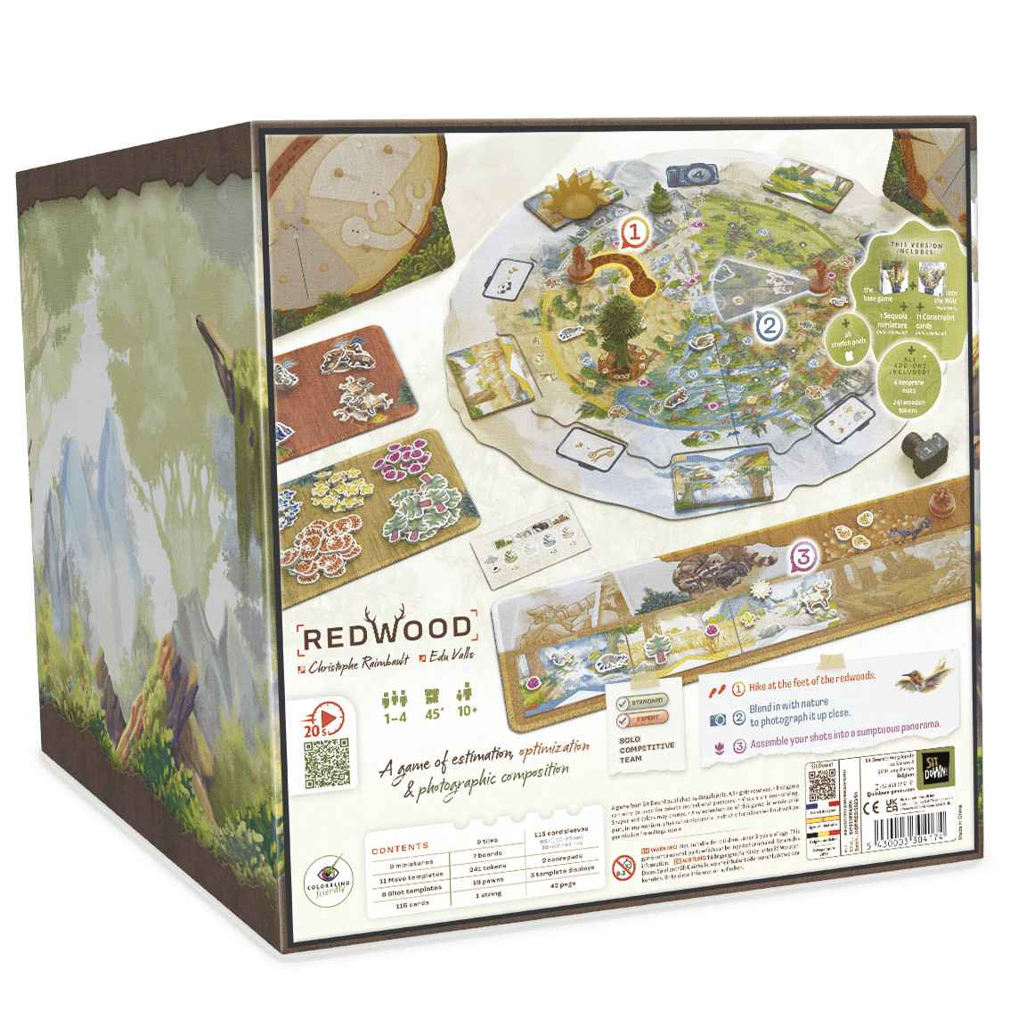 Redwood is a game of estimation. On your turn, choose a Movement template and a Target template. The first allows you to move your figure across the board (without disturbing the animals), while the second lets you capture nature and its inhabitants on the Panorama card you’ve selected.More than just a game, it’s a true bucolic adventure