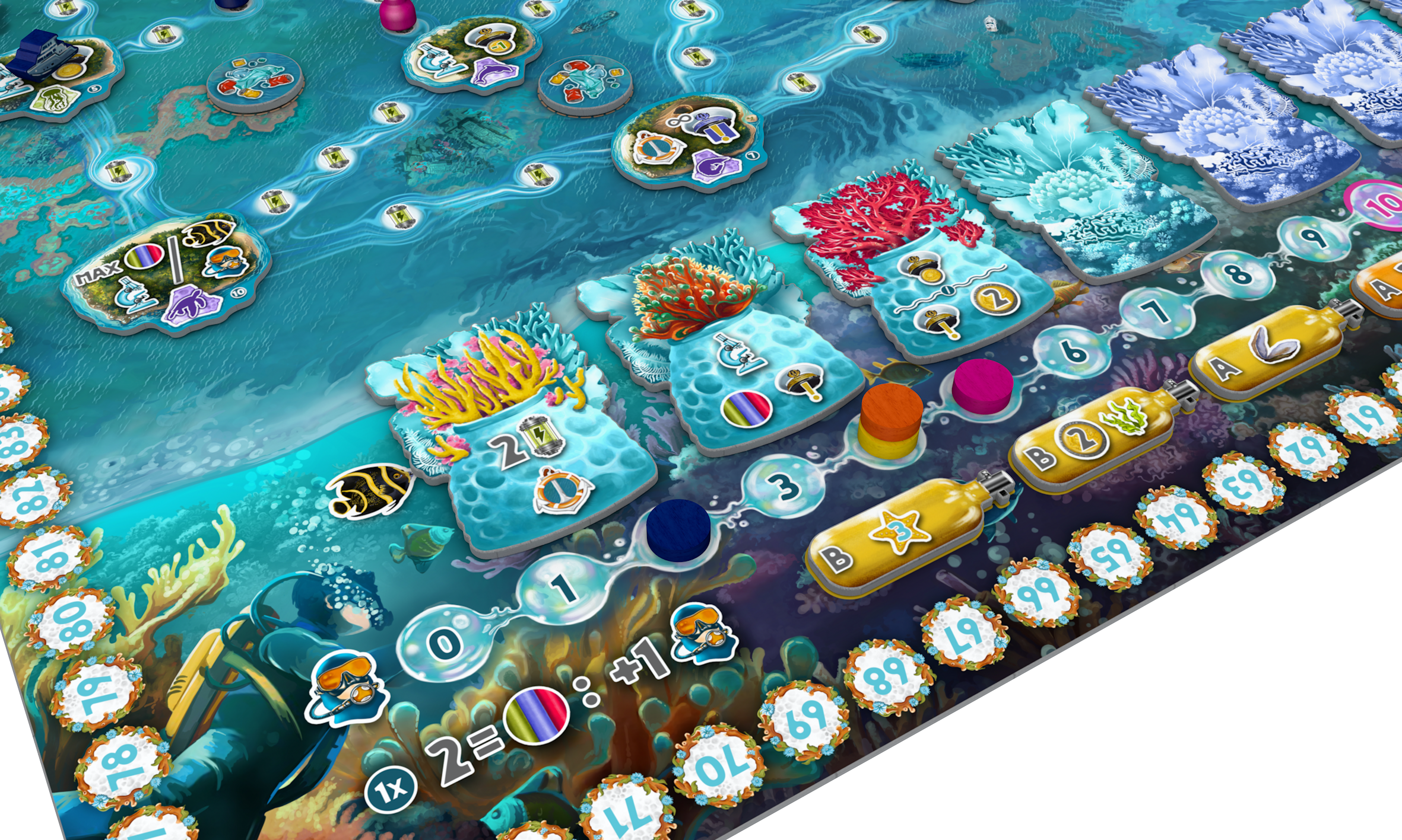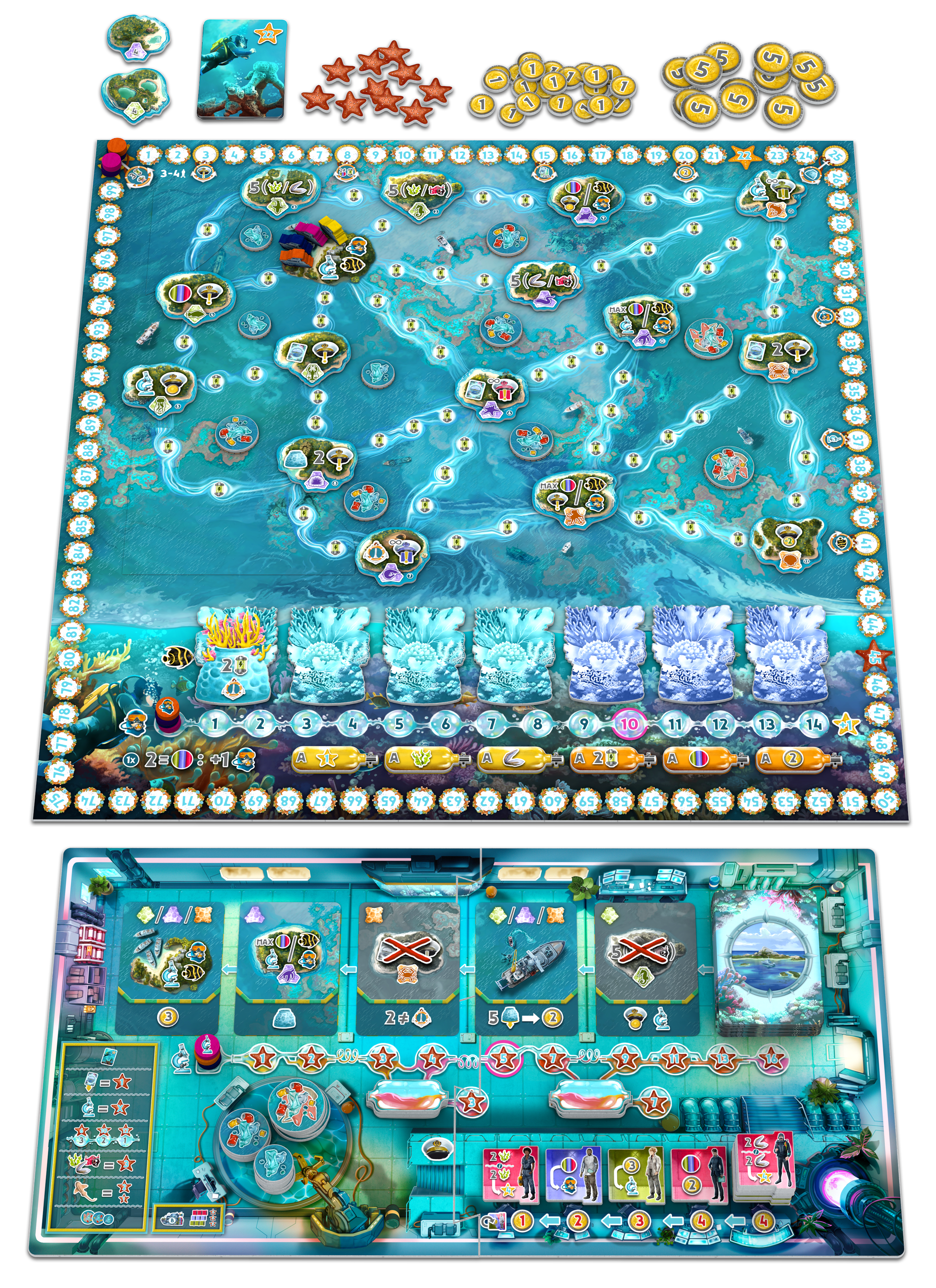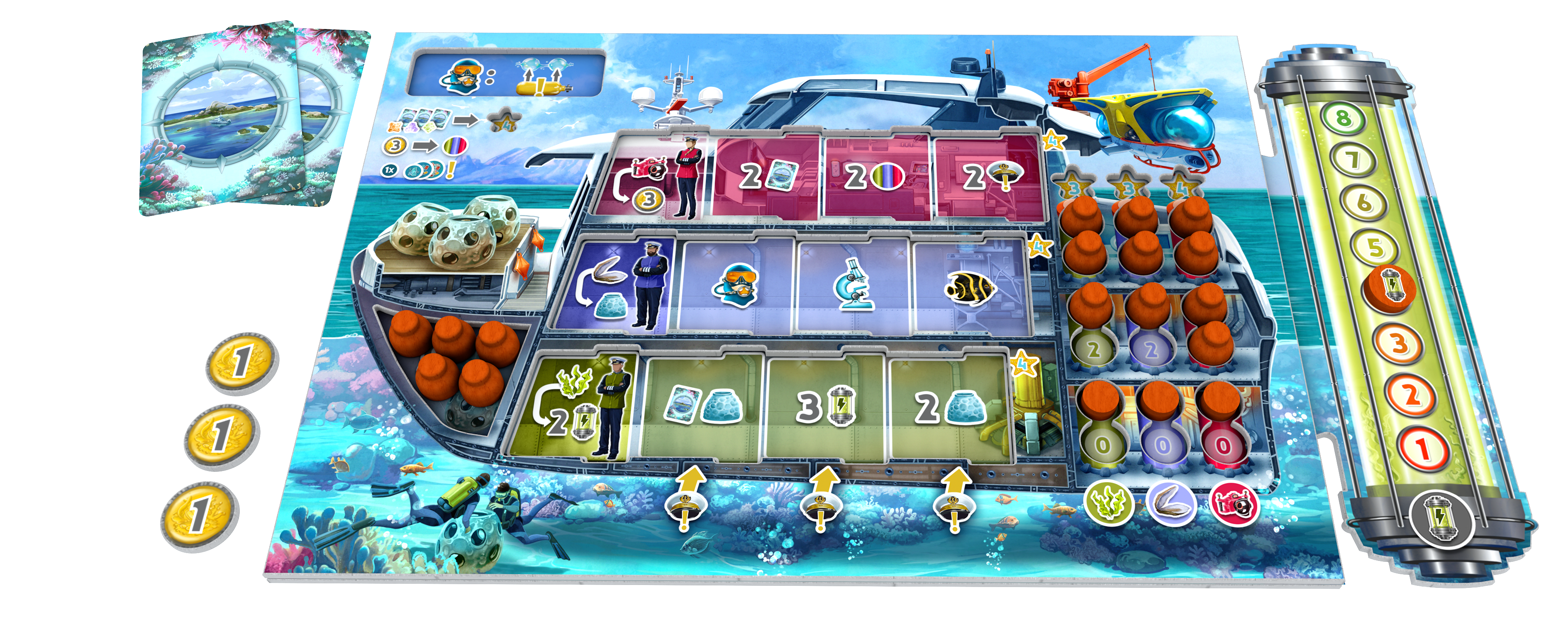 - Replayability - different ships (player powers), different distribution of Islands, Pollution tokens with various effects, Reef tiles, bonus tiles (both on Seafloor and Reputation tracks)