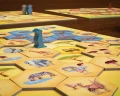 On a turn, you name a specific face-up tile that all players must pick up, flip face down, then move to a different empty space within their own park. Tiles that have been flipped cannot move again, and once all tiles have moved, the game ends with a scoring round. First, tiles adjacent to bush fires are removed if they depict as many animals as the number of fires (1, 2, or 3) on the bush-fire space. Score for each grass and tree uncovered on your board. Finally, score for each of the six animal species; the bigger the main herd of each of species and the more water holes it contains, the more points you score, e.g. a herd of five rhinos and three watering holes is worth (5x3) 15 points. The player with the most points wins.