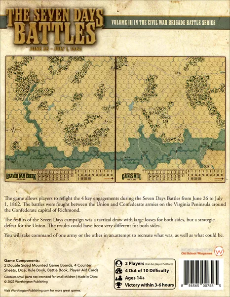 Seven Days Battles 1862 is Volume III in the Civil War Brigade Battle Series. It is an old school style hex and counter wargame that allows gamers to refight battles from the 1862 Seven Days Battles that occurred outside of Richmond, VA. One player will play the Confederate side, and one player will play the Union side. The victory conditions are the destruction of the enemy army and capturing key terrain objectives. The game includes 8 scenarios over 4 separate battles. 2 of the scenarios allow the linking of 2 of the battles.