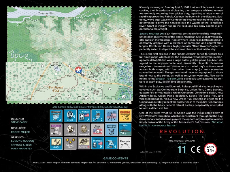Volume: 11 in the Blind Swords series is Shiloh: The First Day designed by Steve Carey. It is the largest game in the series with two 22x34 inch maps and 3 counter sheets. The include sevens scenarios, one of which is played on a small 8.5x11 inch map, 1 played on a 15x19 inch map, and 1 played on a 11x11 inch map for those who want small and quick fights.