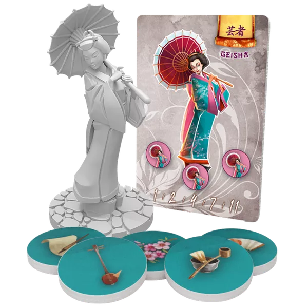 The Geisha is one of the Characters that can be placed on the board at the beginning of the game. She comes with a set of 15 Geisha tokens (3 per type of 5 types).