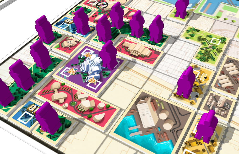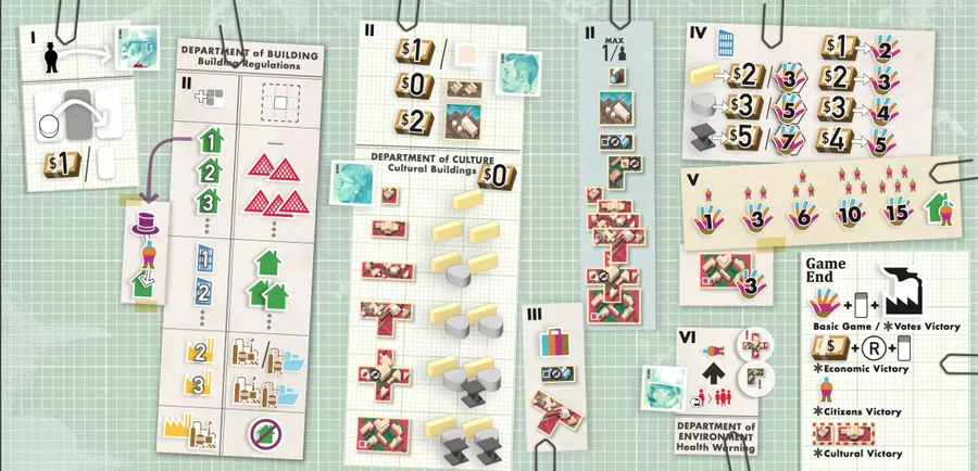 Build Residences, Commerces, Industries. Affect a job to your citizens to Produce Raw material, to build Cultural Buildings and develop your city to be re-elected at the end of 8 rounds. Make Promises to your citizens like good Mayor and develop tourism to opponent players. But don't forget to take care of the pollution level in order to not ruin your effort...