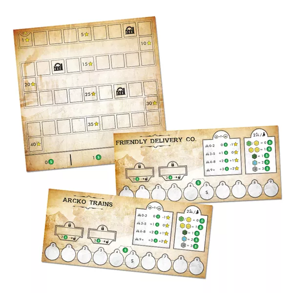 During their turn, players will build their tracks by placing 2 trains on the modular board. When building tracks, players must pay the gold costs for the different terrain that the track passes through. Once a track connects an industry that produces a good with a city that demands that certain good, the player may send a train to complete the delivery and earn gold depending on the track length.