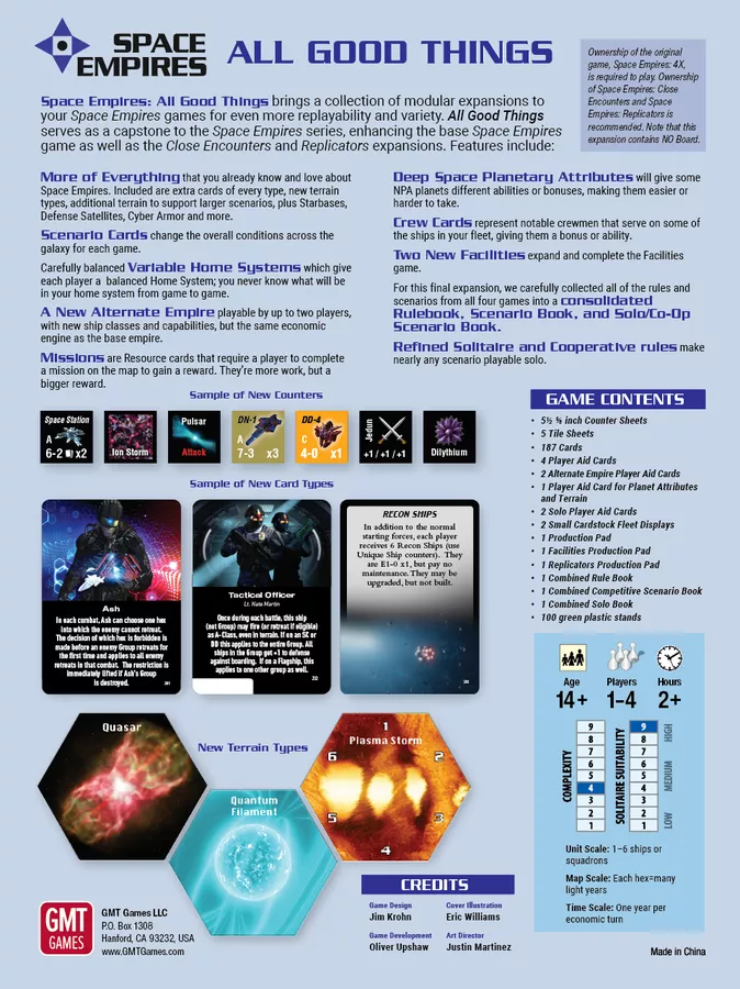 Space Empires: All Good Things is the Third and Final Expansion in the Space Empires series. It is designed to complete the game and add even more replayability and options. Note that this expansion contains NO Board. Ownership of the original game, Space Empires: 4X, is required to play. Ownership of Space Empires: Close Encounters and Space Empires: Replicators is recommended.