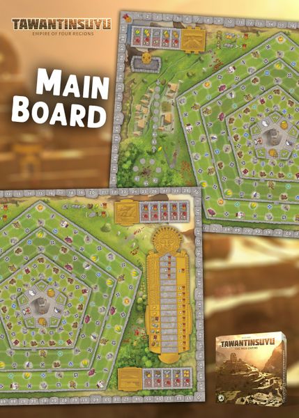 During Tawantinsuyu: The Inca Empire, players place workers onto various locations on the game board, performing actions, collecting resources (potatoes, corn, stone, and gold), constructing buildings and stairs, sculpt statues, expanding their military strength, and collecting weavings.