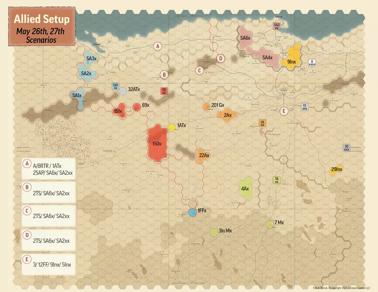 This is complete revision of the Conflict Games edition designed by Frank Chadwick and first published in 1975 — consider this a completely NEW game and not a reprint of a previous edition. This new game features extensively researched and revised orders of battle, conversion to a d10 resolution method, all-new weather rules, all-new air rules showing the army-air force coordination that was being perfected by both sides, an all-new map at half of the original game's ground scale (1.5 mi/hex vs 3 mi/hex), and a switch from an Igo-Yugo to a chit-pull formation activation mechanism. But the most exciting change is a dynamic Operations Phase wherein players can decide exactly when and with which units they want to move, fight, barrage, or call in an air strike. No fixed Movement Phase, Combat Phase, Indirect Fire Phase, or Air Strike Phase...it's up to players how they want to construct their own turns. Neatly reflects the chaos of desert warfare in North Africa.