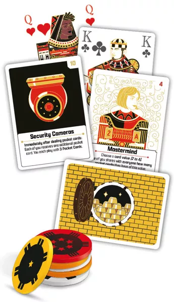 Early in a round, without talking to each other, each player chooses a chip indicating how good they think their hand is. Then they begin dealing cards into the middle of the table and have a chance to reassess their hands as more cards are revealed. At the end of the round, players see whether they correctly evaluated their hand. If all players did, you get to open one of the bank vaults! If not, you trip the alarm! If you manage to open three vaults before you trip the alarm three times, your gang wins!