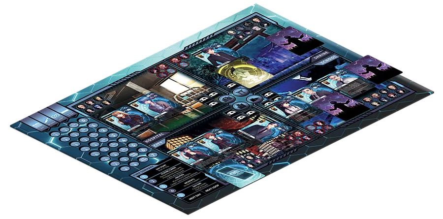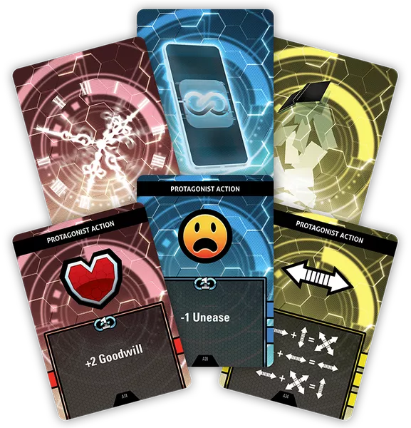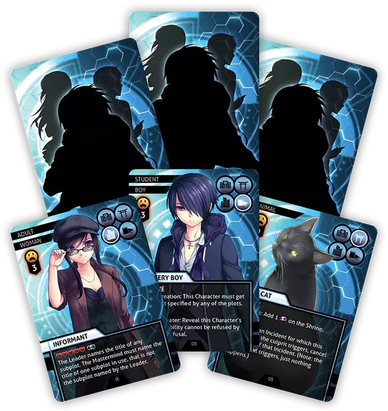 In Tragedy Looper: New Tragedies, 1-3 players are Protagonists attempting to escape a time loop engineered by one player acting as the Mastermind. The Mastermind player selects a script, either one of the 13 scripts included or one created themselves, and sets up the game accordingly. The Protagonist players don't yet know the details of the tragic events about to unfold.