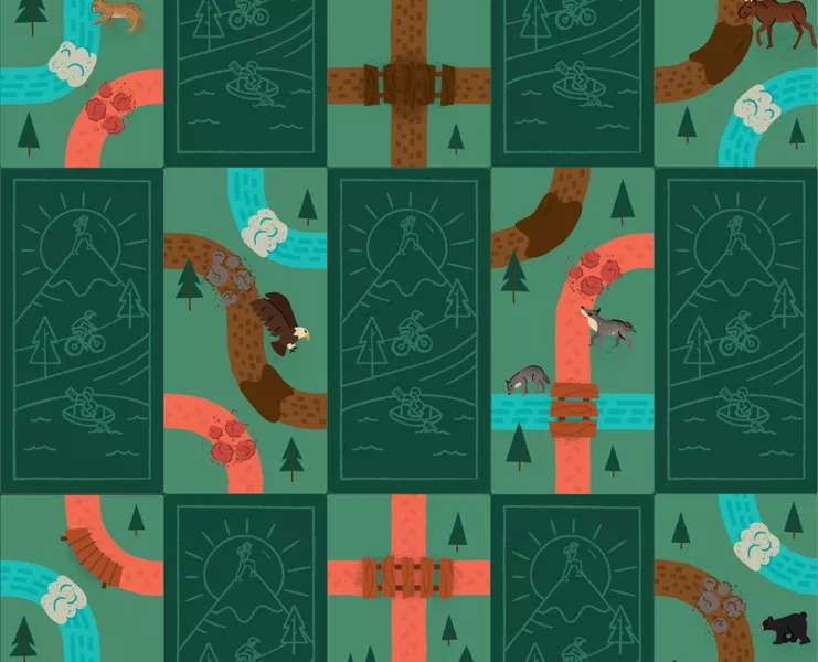 In Trailblazers, players compete to earn the most points by building biking, hiking, and kayaking loops from their campsites of the matching trail type. Each round, players are dealt eight trail cards where they’ll draft two cards, arrange those cards in their personal area, and pass their hand to the next player three times. Cards must either be placed adjacent to or overlapping other cards. While players can push their luck by aiming to construct long and elaborate trails, only closed loops that start and end at a matching campsite will score points. Players also compete to fulfill “First To” and “End Game” goal cards. After four rounds, the game ends and the player with the most points from closed loops and goal cards wins.