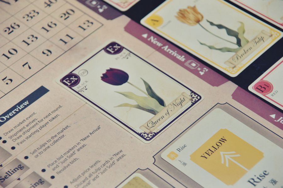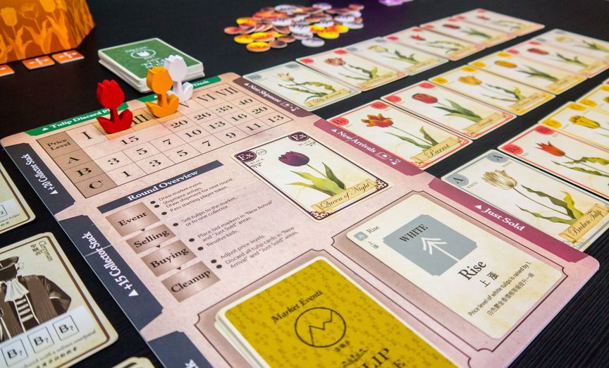 In Tulip Bubble, players buy and sell on a fluctuating market, trying to earn the most guilders. The game flow includes a preparation phase, buying phase, and selling phase, with these phases recurring until the bubble collapses or someone manages to outwit the markets by purchasing a black tulip for 120 guilders before that collapse occurs.