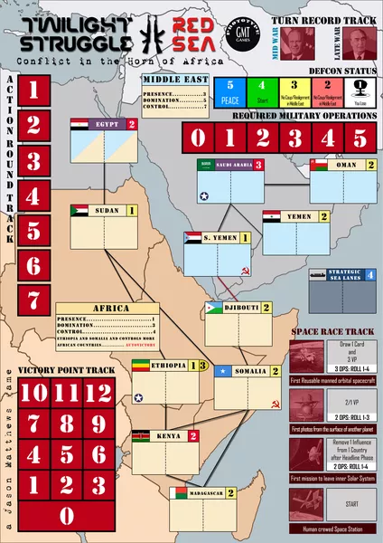 Part of GMT's Lunchtime Series, Twilight Struggle: Red Sea – Conflict in the Horn of Africa is a two-player card driven game that builds on the award winning Twilight Struggle.