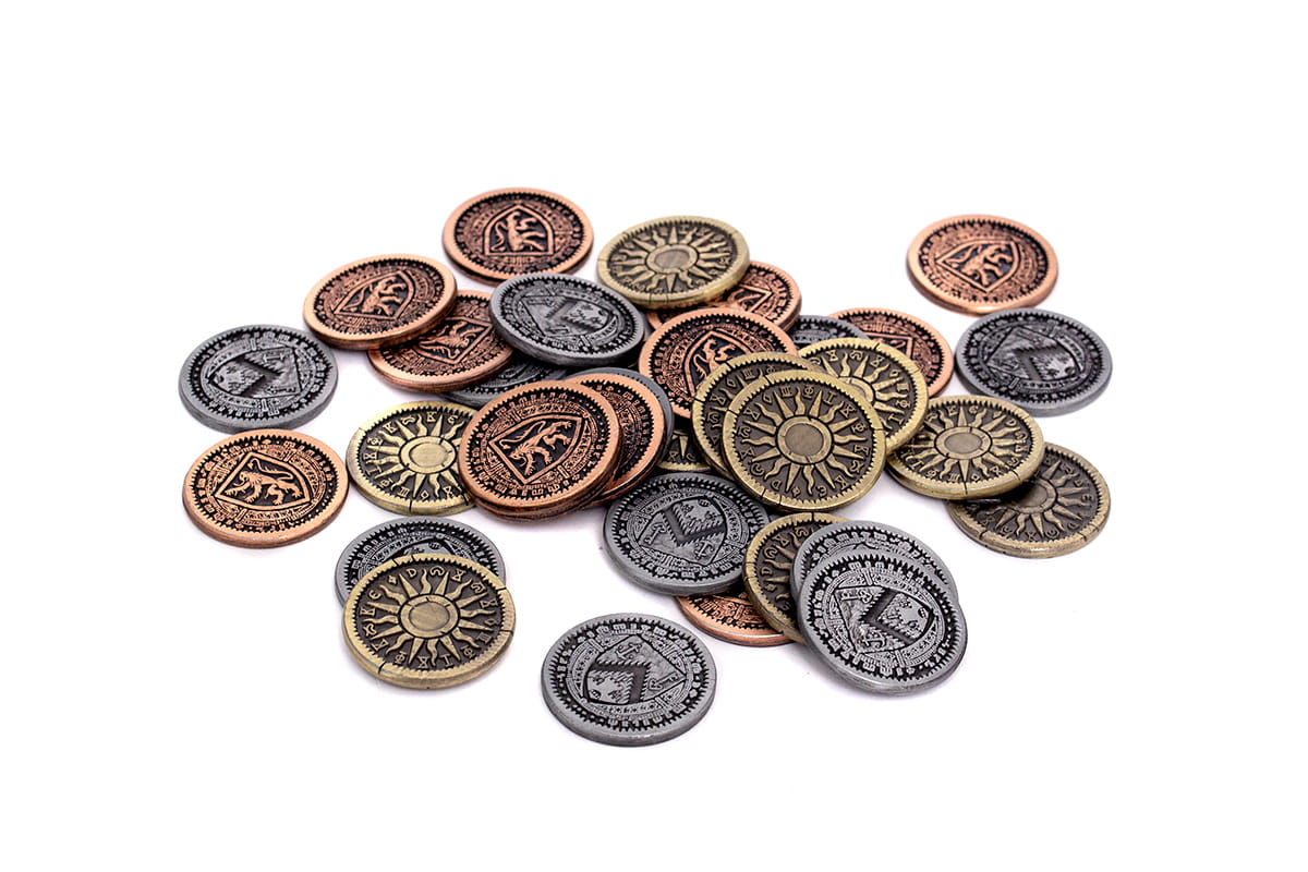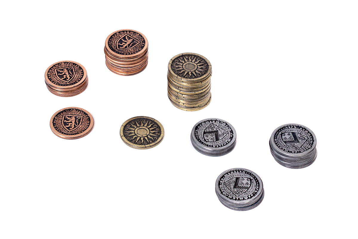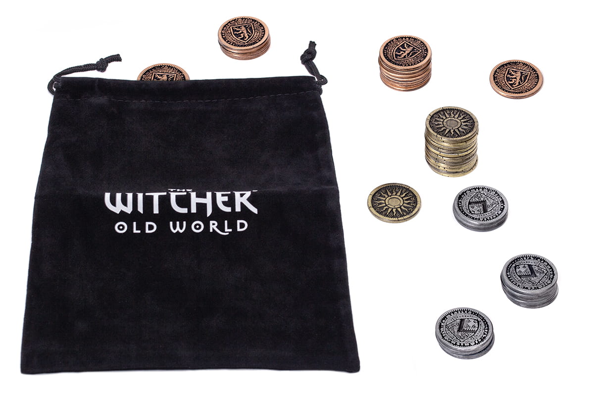 Zainwestuj w komfort rozgrywki, zapełnij sakwę i już dziś wymień znaczniki złota na solidną, brzęczącą walutę! Wiedźmin: Stary Świat - Metalowe monety to zestaw 30 krążków zapakowanych w praktyczny woreczek. Monety reprezentują 3 waluty dostępne na kontynencie, jednak wartość każdej z nich w grze wynosi 1.