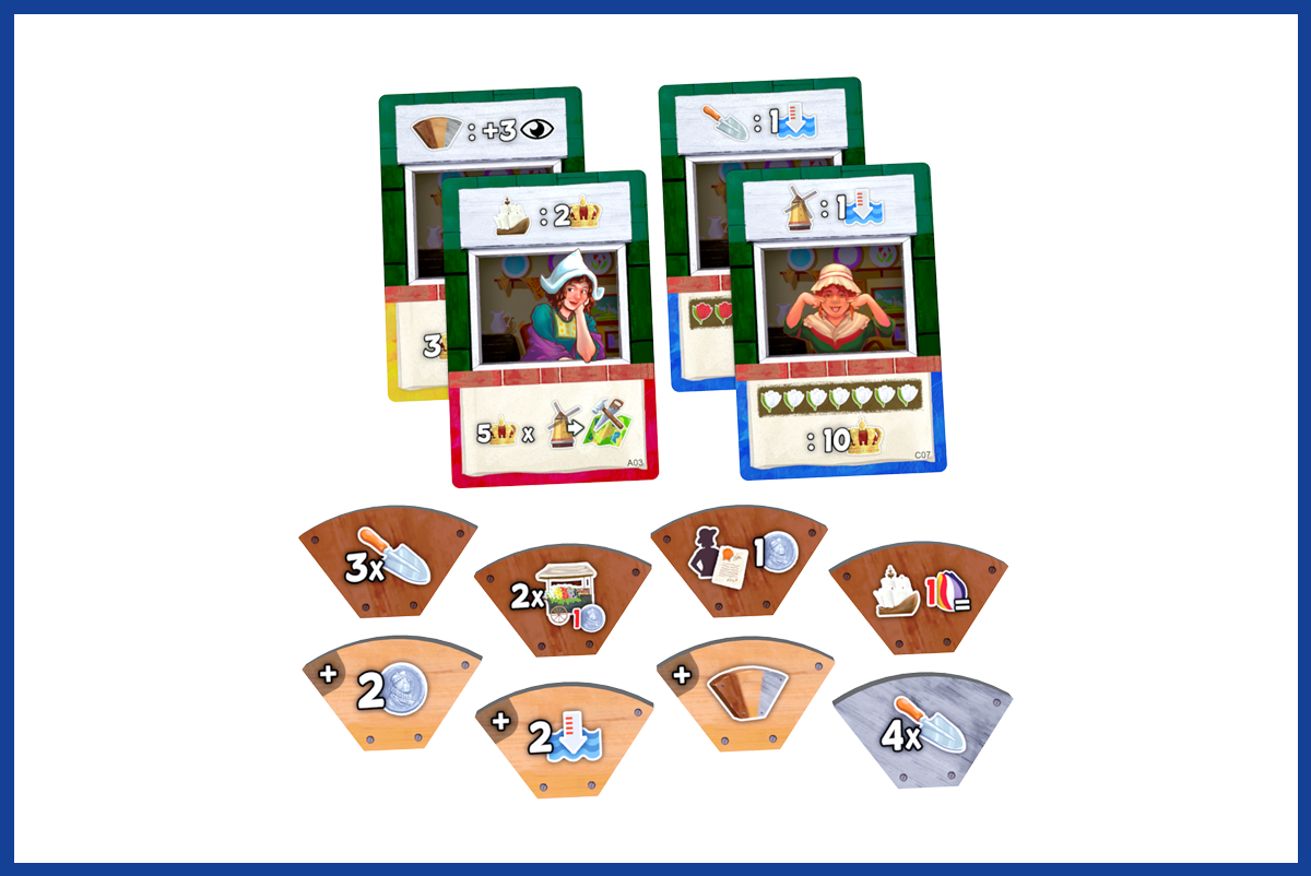 In Windmill Valley , a game inspired by the Bloemen Route, you and up to three players take on the role of tulip farmers and entrepreneurs. You will build and enhance your windmills, look for new tulip bulbs in foreign trades or among local vendors to buy and plant, and try to get an edge with hired help and lucrative contracts. Let your blooming fields make your competitors green with envy!