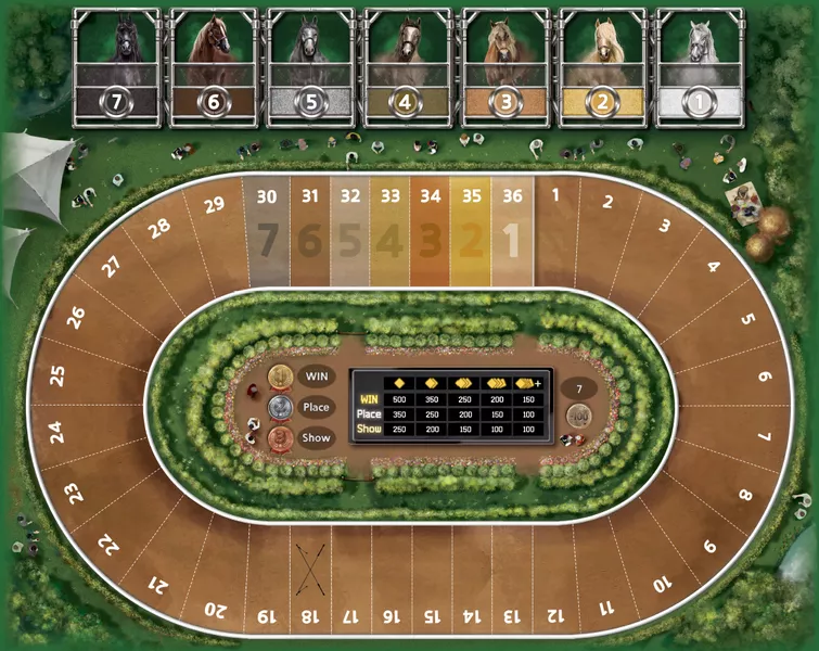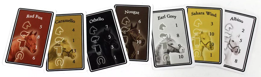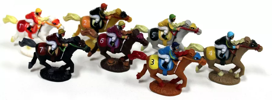A lively game of horse racing where players bet on several of seven horses to try to gain the most money by the end of the game.