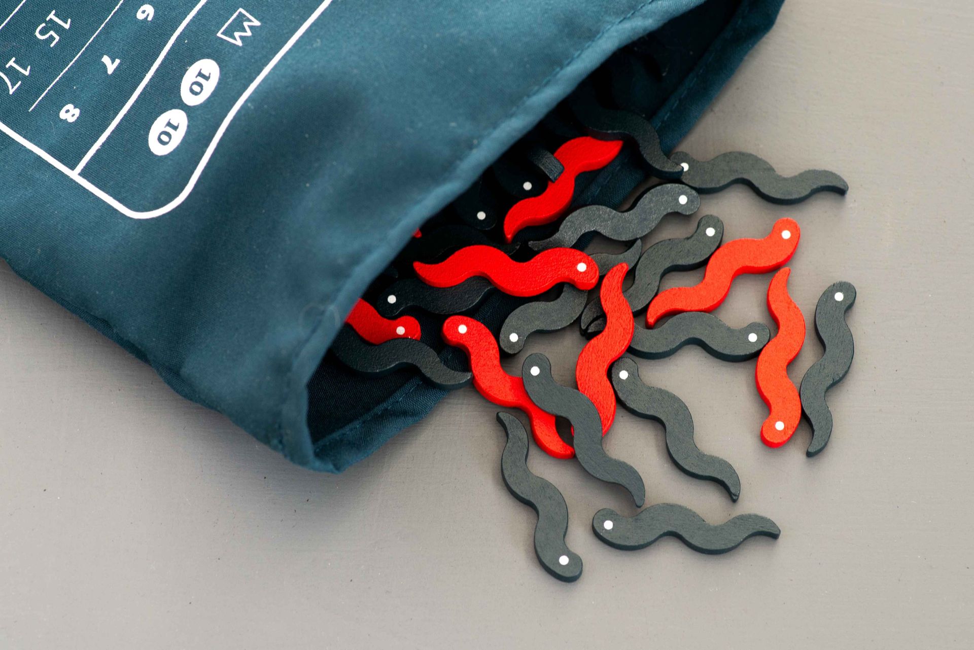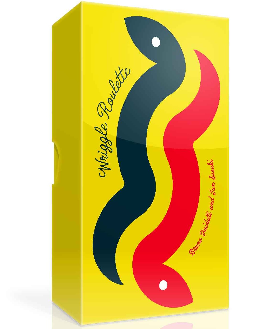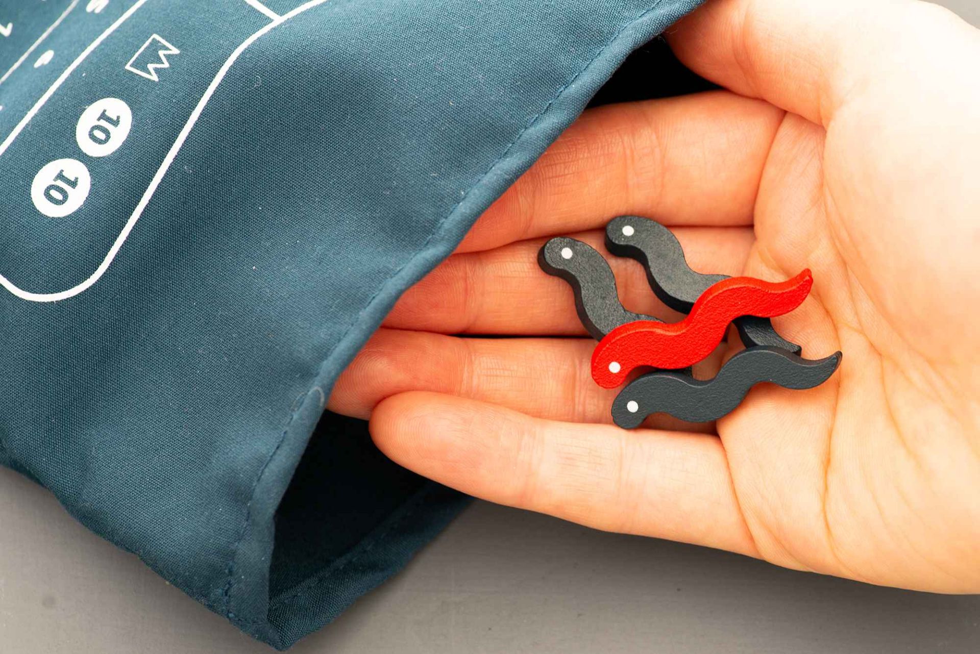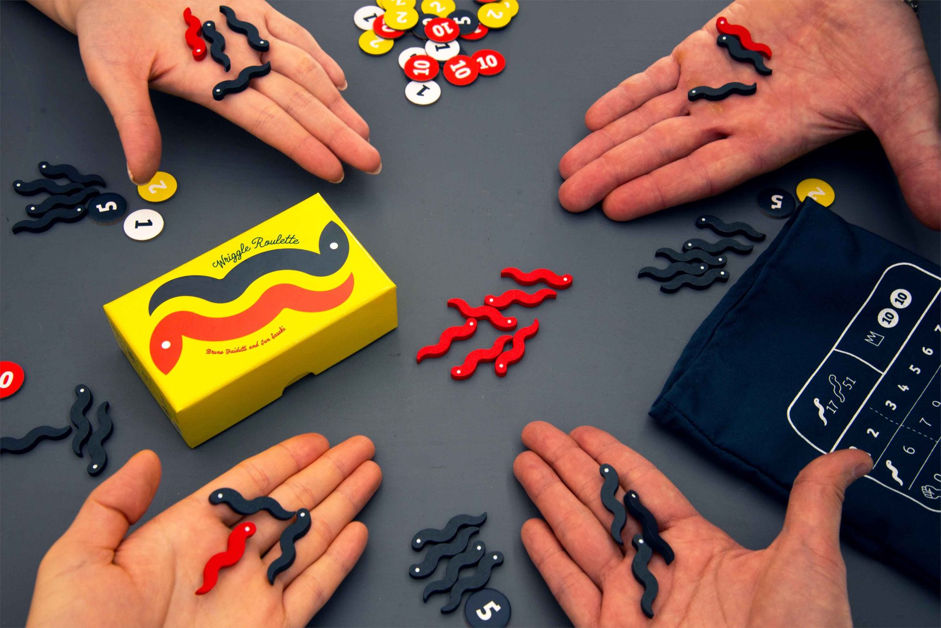 In Wriggle Roulette, players take turns reaching into a bag filled with eel- and snake-shaped wooden pieces, trying to pull out as many eels as possible — but if the number of snakes grabbed by all players exceeds the limit, a "snake outbreak" occurs, and the player who grabbed the most pieces loses all of their eels.