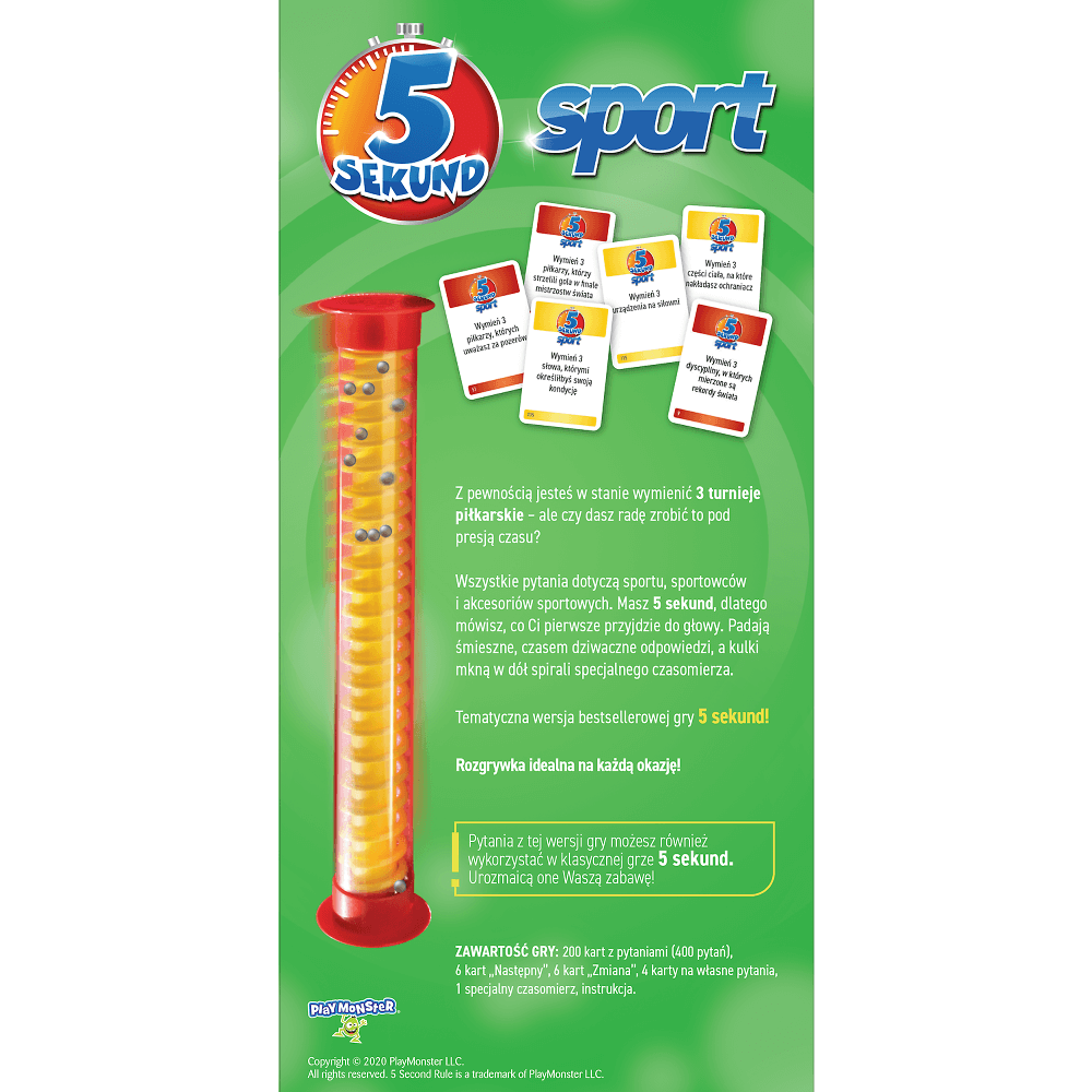 Wszystkie pytanie, które znajdziesz w opakowaniu, dotyczą sportu, sportowców i marek prorduktów sportowych. Masz tylko 5 sekund, aletego mówisz, co Ci pierwsze przyjedzie do głowy. Padają śmieszne, czasem dziwne odpowiedzi, a kulku w specjalnym czasomierzu mkną w dół - Twój czas się kończy.