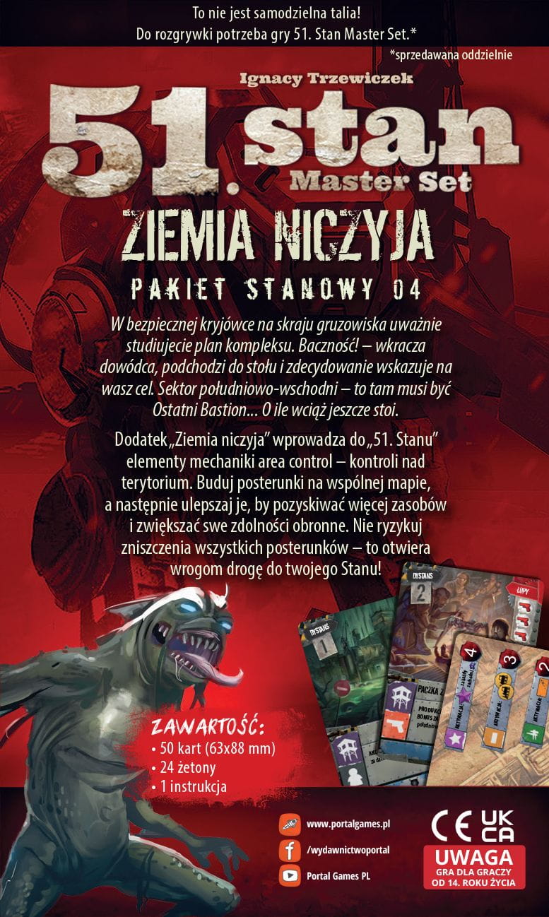 Dodatek „Ziemia niczyja” wprowadza do „51. Stanu” elementy mechaniki area control – kontroli nad terytorium. Buduj posterunki na wspólnej mapie, a następnie ulepszaj je, by pozyskiwać więcej zasobów i zwiększać swe zdolności obronne. Nie ryzykuj zniszczenia wszystkich posterunków – to otwiera wrogom drogę do twojego Stanu!