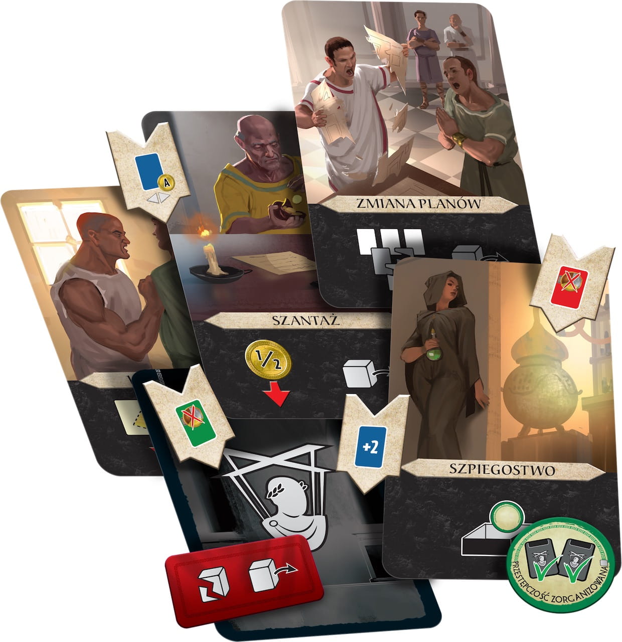 - Karty spisku reprezentujące tajne działania, które możemy przygotować i aktywować w karcie gry.