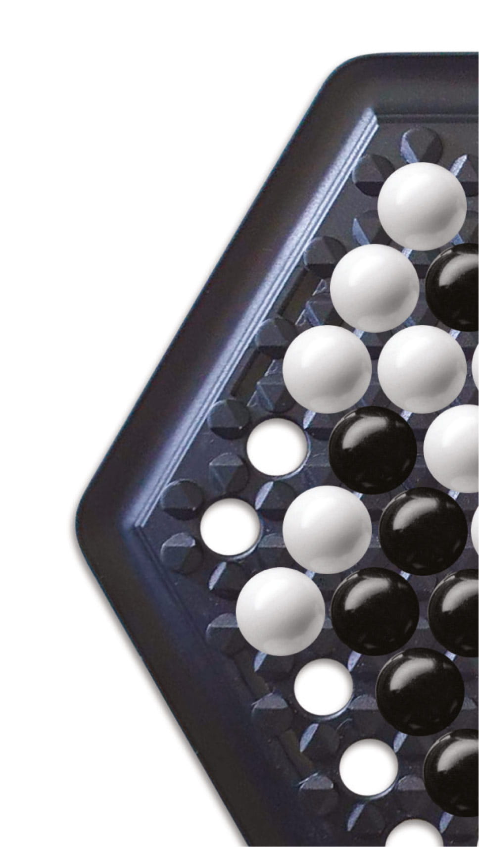 Dwoje przeciwników zasiada naprzeciwko siebie, by wziąć udział w angażującym pojedynku umysłów. Na sześciokątnej planszy znajdują się czarne i białe kule – każdy z graczy posługuje się jednym z kolorów. Aby wygrać, należy wepchnąć 6 kul przeciwnika do rynienki biegnącej wzdłuż krawędzi. Obserwuj, planuj... i rozważaj możliwe posunięcia przy każdym kolejnym ruchu!