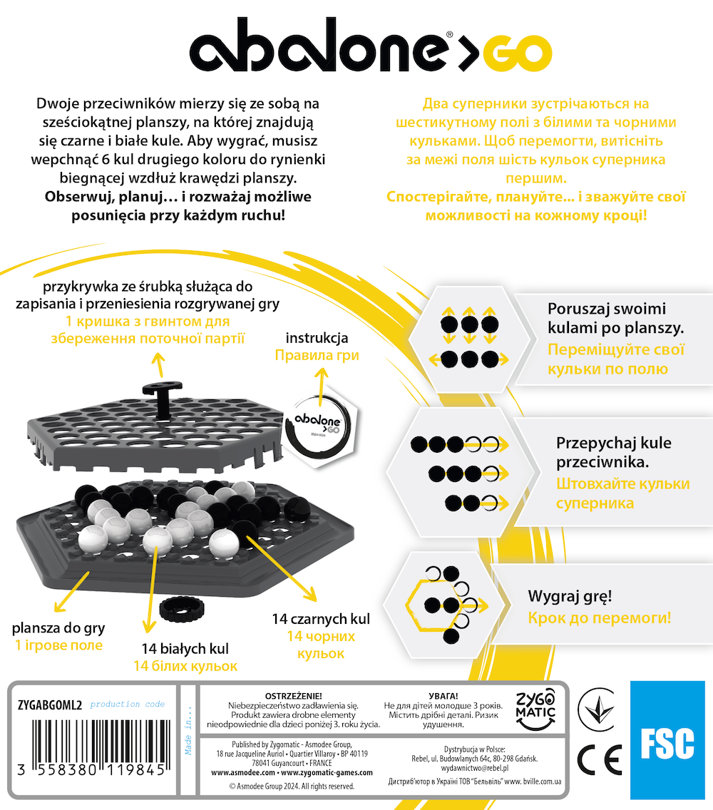 Abalone GO to specjalna, kompaktowa wersja popularnej dwuosobowej gry logicznej w pełni dostosowana do tego, żeby zabrać ją ze sobą, gdzie tylko zechcesz! Elementy zostały pomniejszone, a praktyczna nakładka na planszę pozwala na „zapisanie” rozgrywki i przeniesienie zawartości bez ryzyka jej przemieszczenia.