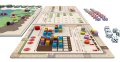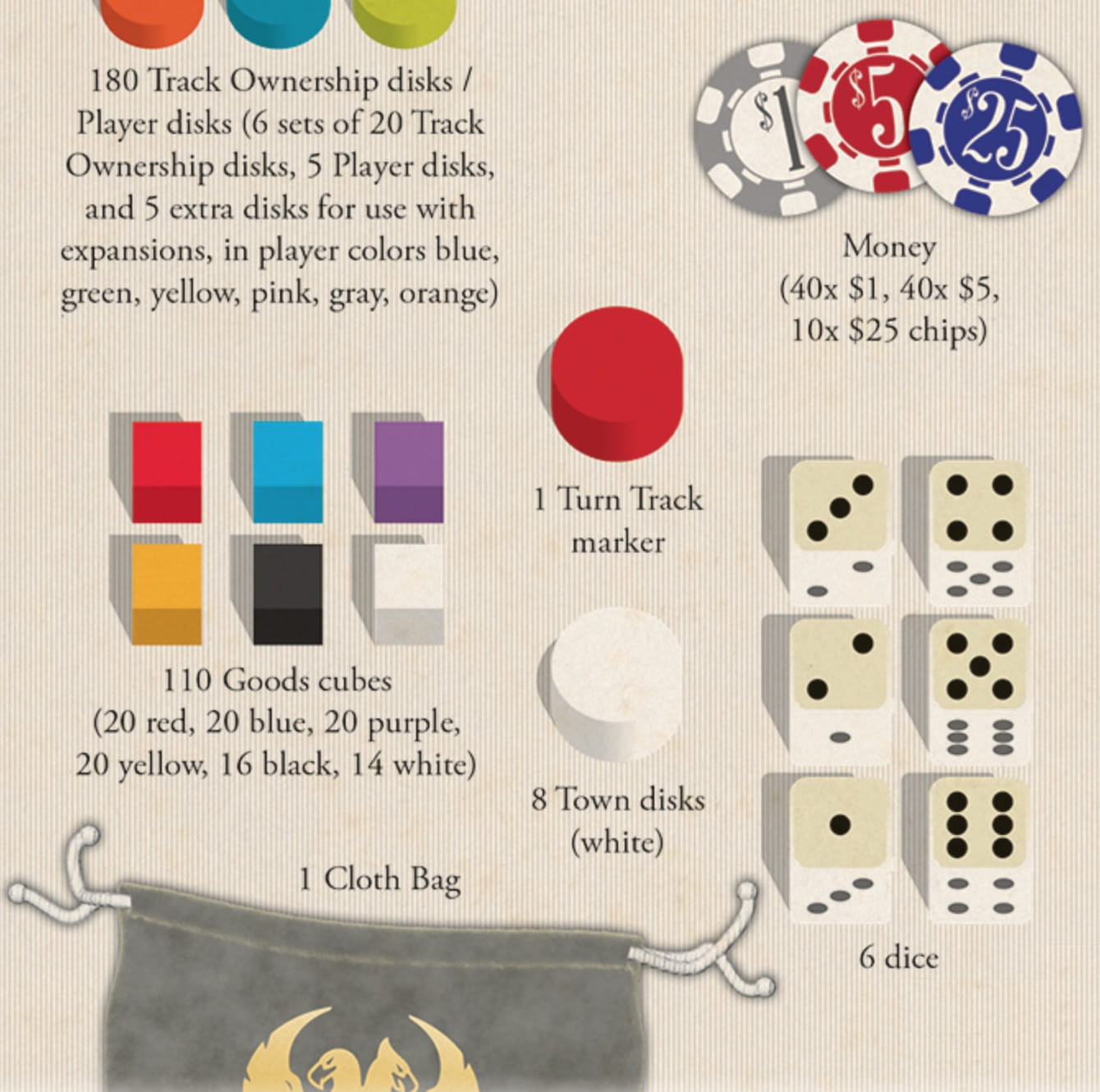 - Klasyczne drewniane okrągłe dyski w 6 kolorach reprezentujące własność torów (drewniane pociągi dostępne tylko w wersji Kickstarter Conductor)