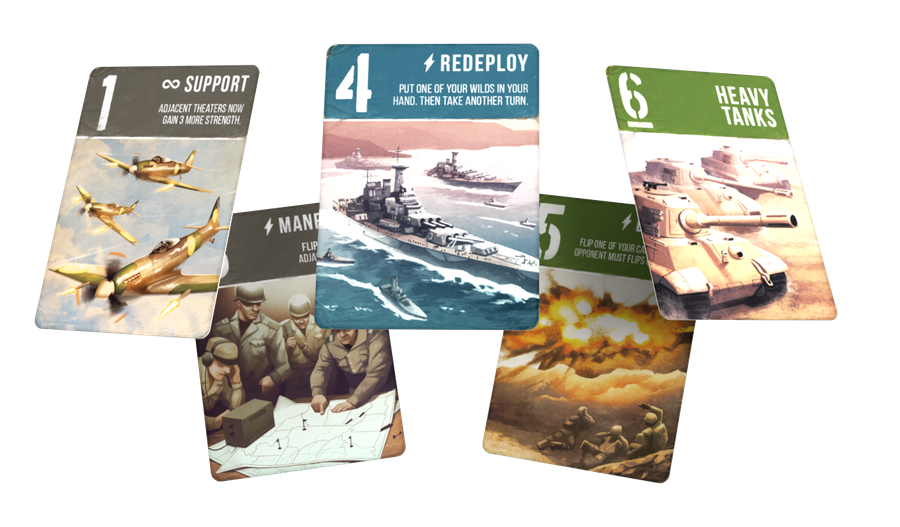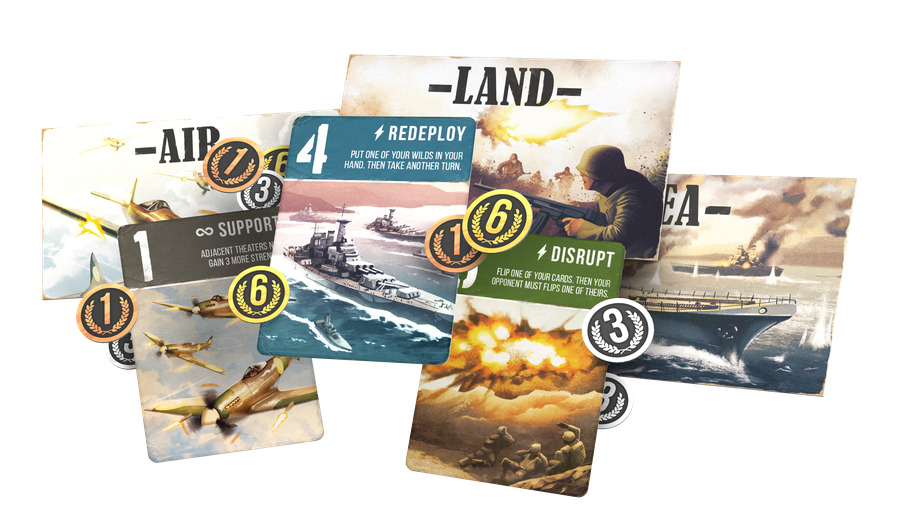 As Supreme Commander of your country's military forces, you must carefully deploy your forces across three possible theaters of war: Air, Land, and Sea. The order you play your Battle cards is critical, and so is how you play them. All cards can either be played face-up or face-down. Playing a card face-up triggers its Tactical Ability, but the card must be played in its corresponding theater. Face-down cards are wild and can be played to any theater, but only have a strength of 2 and do not grant Tactical Abilities.