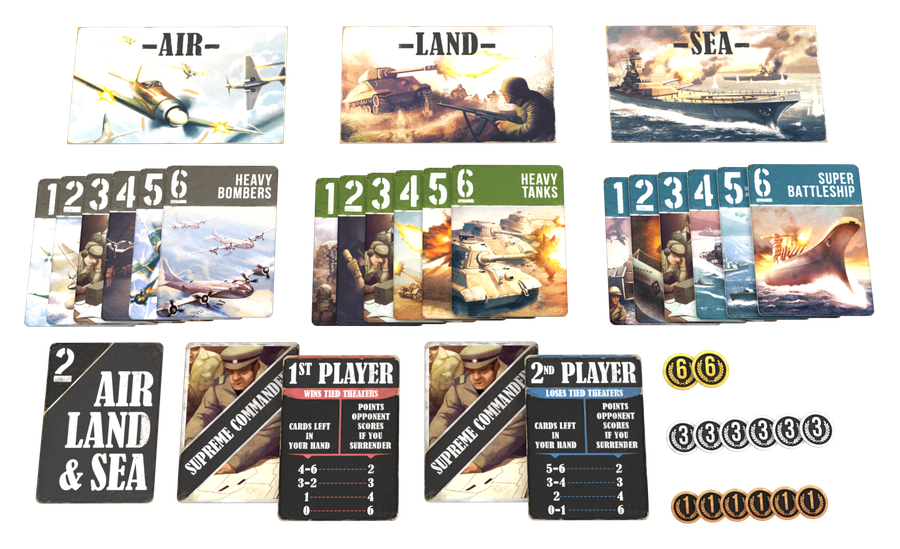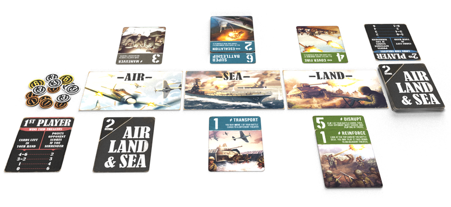 In Air, Land, & Sea, two players participate in a series of Battles, with the objective to control two of the three Theaters of war after both players have played all of their Battle cards, or convince your opponent to withdraw!