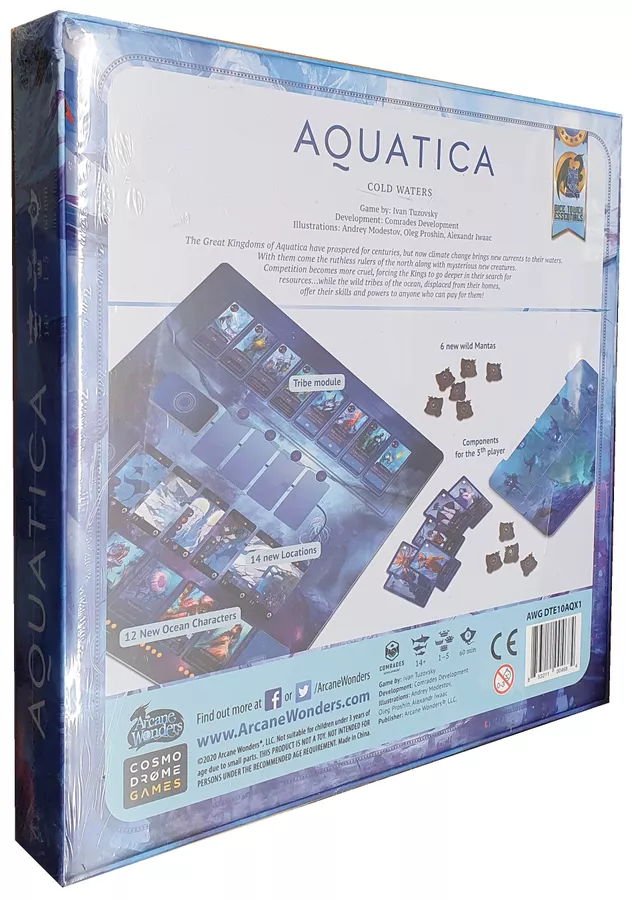The Aquatica: Cold Waters expansion adds several modules including a new location type, new Ocean’s creatures cards, and an alternative mechanic that replaces the goal track in the base game. It also includes all necessary components for a fifth player!