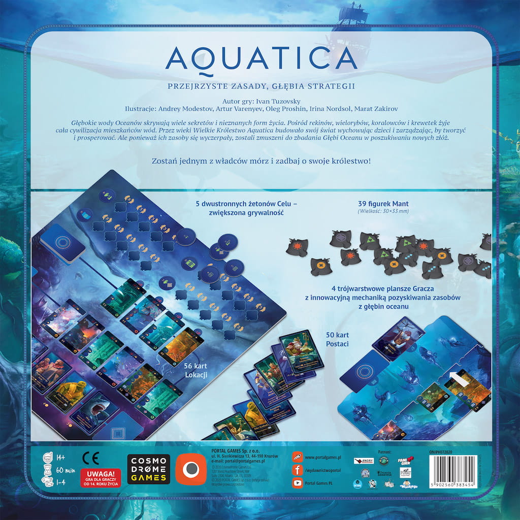Aquatica to gra planszowa dla 1-4 graczy. Każdy z was wciela się w rolę jednego z Królów Oceanu próbując znaleźć zasoby dla swojego królestwa. Waszym celem jest posiadanie największej liczby Punktów Zwycięstwa na koniec gry. Aby je zdobyć, musicie eksplorować, podbijać i kupować Lokacje, werbować nowe Postacie i wypełniać Cele. Gracz z największą liczbą Punktów Zwycięstwa i najlepiej prosperującym królestwem zostanie ogłoszony najwspanialszym władcą wśród Królestw Aquatiki.