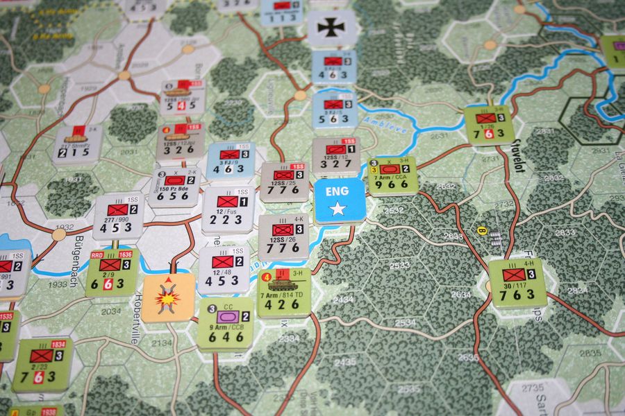The result is Ardennes '44, a game that both the "Bulge enthusiast" and the casual player will enjoy. German attacks follow historical advance routes, and the Bastogne and St. Vith defense perimeters are often as large as they were historically (instead of one big stack of units in the town itself). The Allied player has a chance at holding Elsenborn Ridge and making the Germans pay dearly for the twin villages of Rockerath and Krinkelt. Likewise, the German player has an equal chance of changing history and reaching the Meuse River.