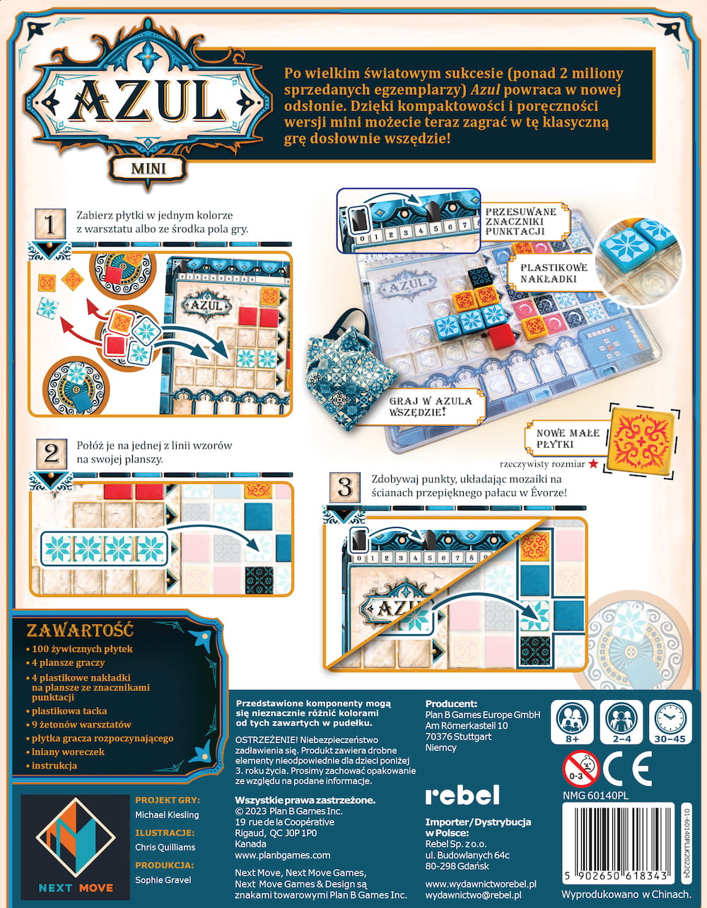 Po wielkim światowym sukcesie (ponad 2 miliony sprzedanych egzemplarzy) gra logiczna o układaniu mozaik powraca w zupełnie nowej odsłonie! Azul Mini to kompaktowa wersja w pełni dostosowana do tego, by zabrać ją ze sobą w podróż. Wszystkie elementy z klasycznej edycji zostały pomniejszone, by były bardziej poręczne. Dodatkowo w pudełku znajdziesz praktyczne nakładki na plansze zapobiegające przesuwaniu się kafelków, a także lnianą torbę, w którą zapakujesz wszystkie elementy. Dzięki temu możesz grać dosłownie wszędzie!