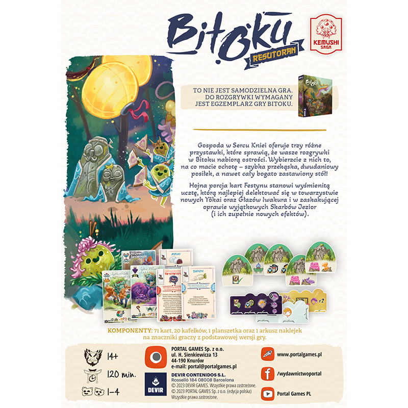 Witajcie w Gospodzie w Sercu Kniei! Ten dodatek do Bitoku zawiera 3 różne Przystawki – a raczej moduły: Gawędy, Kodamy i Festyn. Możecie wybrać jedną , dwie , a nawet wszystkie trzy w dowolnej kombinacji . My zalecamy dodawanie ich stopniowo, by móc w pełni delektować się nowymi smakami! W pudełku znajdują się również naklejki na znaczniki graczy z gry podstawowej.