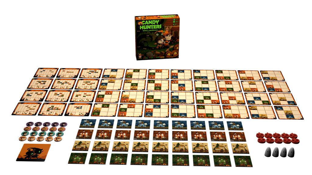Candy Hunters: Łowcy cukierków to taktyczna gra logiczna. Tworzycie wzory na planszy, punktując za cele na kartach Układów. Wykorzystujecie Duchy, by optymalnie ustawić swoje znaczniki i przeszkadzać przeciwnikom, strasząc ich Dzieciaki.