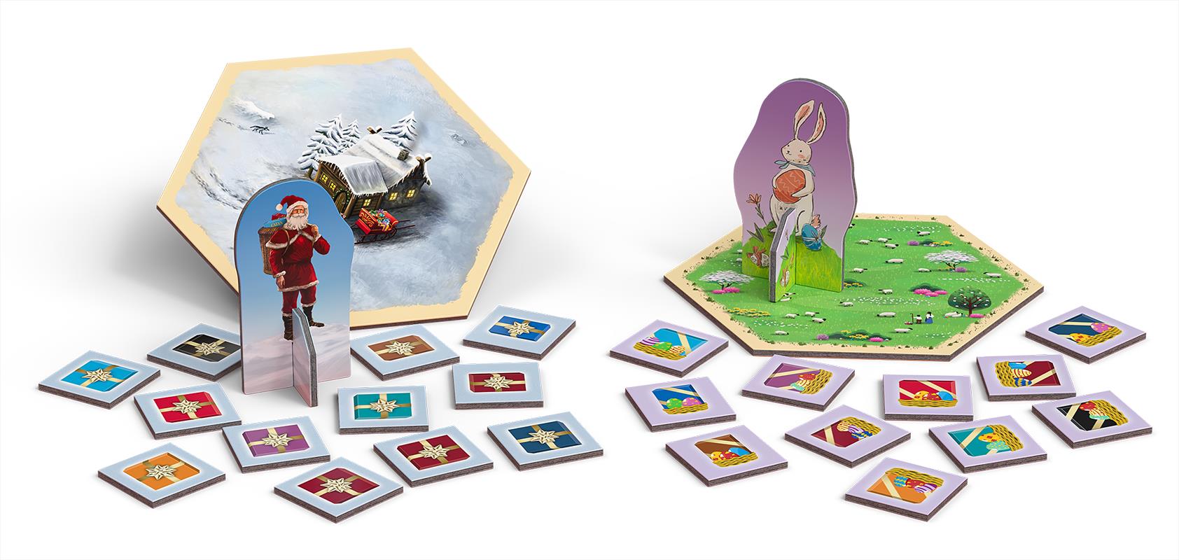 CATAN – Gra planszowa, dodatek dla 5–6 graczy oraz 3 scenariusze w jednym pudełku! W 3 scenariuszach poznasz hojną stronę innych oraz pomożesz Świętemu Mikołajowi i zajączkowi wielkanocnemu... a ci odwdzięczą się prezentami! Wszystkie dodatki mogą być rozgrywane w nawet 6 osób i pozwalają poznać CATAN od nowej strony.