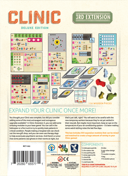 Clinic: Deluxe Edition – 3rd Extension adds 12 expansions and 3 related variants to Clinic: Deluxe Edition, including the following: