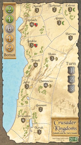 Crusader Kingdoms is a hand management game set in this era, in which up to 4 players control the main Christian or Muslim kingdoms of Outremer. Each turn players receive a variable number of cards that can be troops, events or response cards, and playing in alternate rounds they use them to try to expand their realm. The winner is the player controlling more areas at the end of the game.