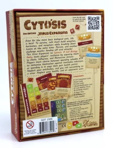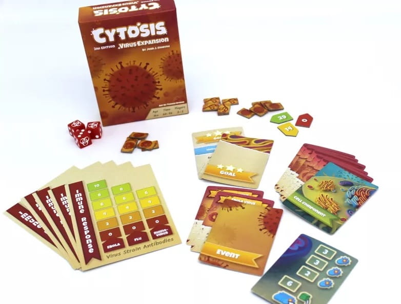 The Virus Expansion expands upon the base game for Cytosis. The expansion adds Influenza, Rhino Virus and Ebola. Player may pay ATP to build up their antibodies to each of the three viral strains. When a Virus attacks, all players will roll a number of antibody dice according to their level of health and add it to the antibodies they've accumulated throughout the game.