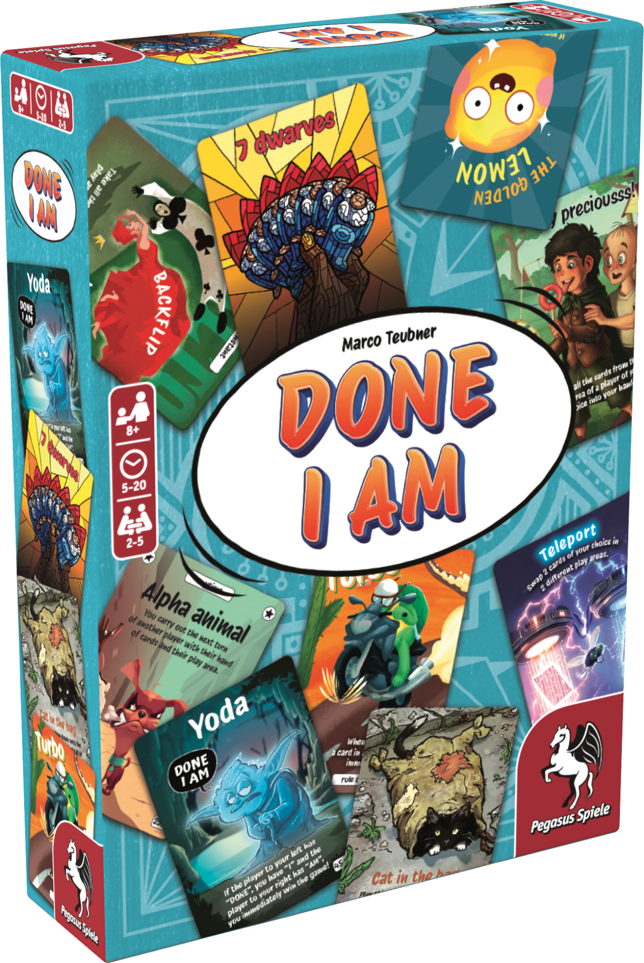The game rules are easy to explain: To win, a player must be the first to place the three cards “DONE,” “I,” and “AM” in front of them. The player whose turn it is may either draw a new card or play a card from their hand and do what the card says. However, these basic instructions are more of a guideline because what actually takes place during a turn is dictated by the chaotic instructions found on the cards. For example, the “Dumpster wheel” first causes the discard pile to be shuffled into the draw pile, then two cards are drawn. A player could place a “Surprise!” “Orders from high above,” or “Schrödinger's nightmare” card, which can really shake up the game. DONE I AM contains 83 new cards, illustrated by 35 artists, and adds even more twists, turns and fabulously fun nonsense.