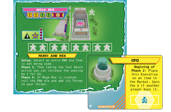 Dinosaur Island: Totally Liquid adds components needed to play Dinosaur Island with up to five players, in addition to adding water dinosaurs to the base game, new parkboard extensions, executive worker meeples that give unique worker abilities to each player, a blueprints module that rewards players when they build certain park layouts, PR events that create hidden scoring opportunities, and more.
