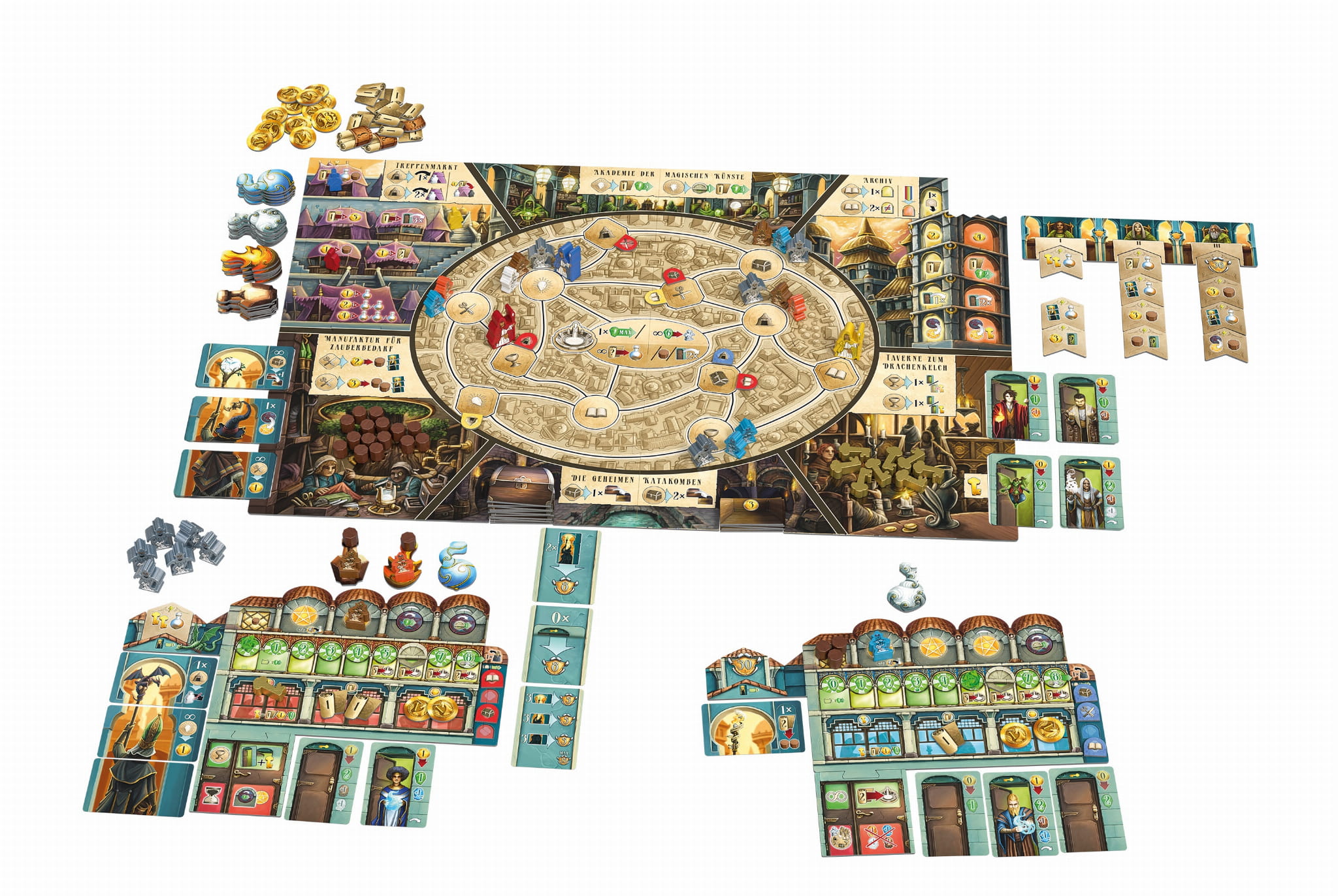 In Djinn, you take turns moving across a map that shows thirteen locations. These locations are linked to actions where you can get the resources you need and catch the Djinn that are in six locations. In those locations you can do things like receive bottles and corks, collect magical power, buy magical items, hire mages to accompany you, discover secret passages, and more.