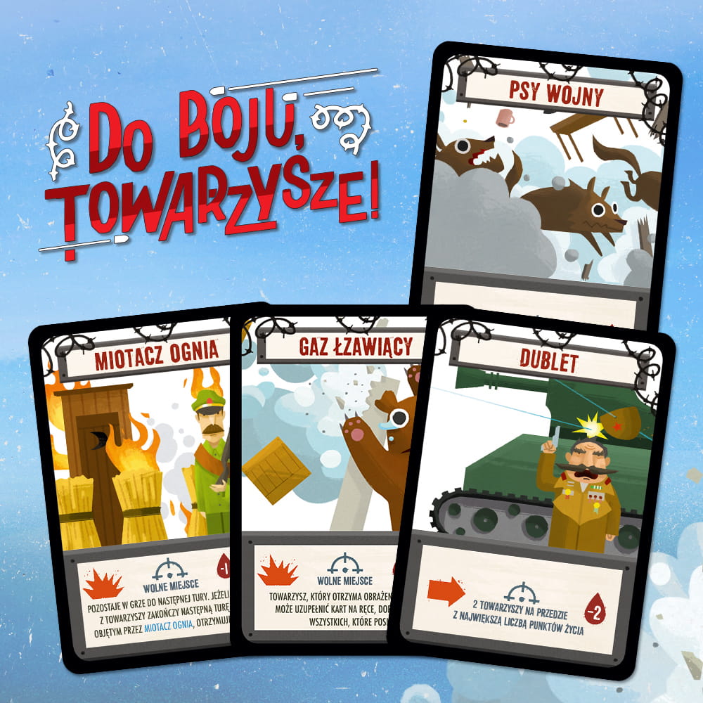 Zagrywaj karty Manewrów i Wydarzeń, by skryć się za plecami innych… ale najpierw musisz przewidzieć ich ruchy! Zbieraj Ekwipunek - Hełm, Kamizelka czy Maska Gazowa mogą uratować Cię przed stratą życia. Równoczesna, dynamiczna rozgrywka sprawi, że ani przez chwilę nie poczujesz się bezpiecznie! Pamiętaj, nie chcesz być na celowniku! Przeżyj, to rozkaz!