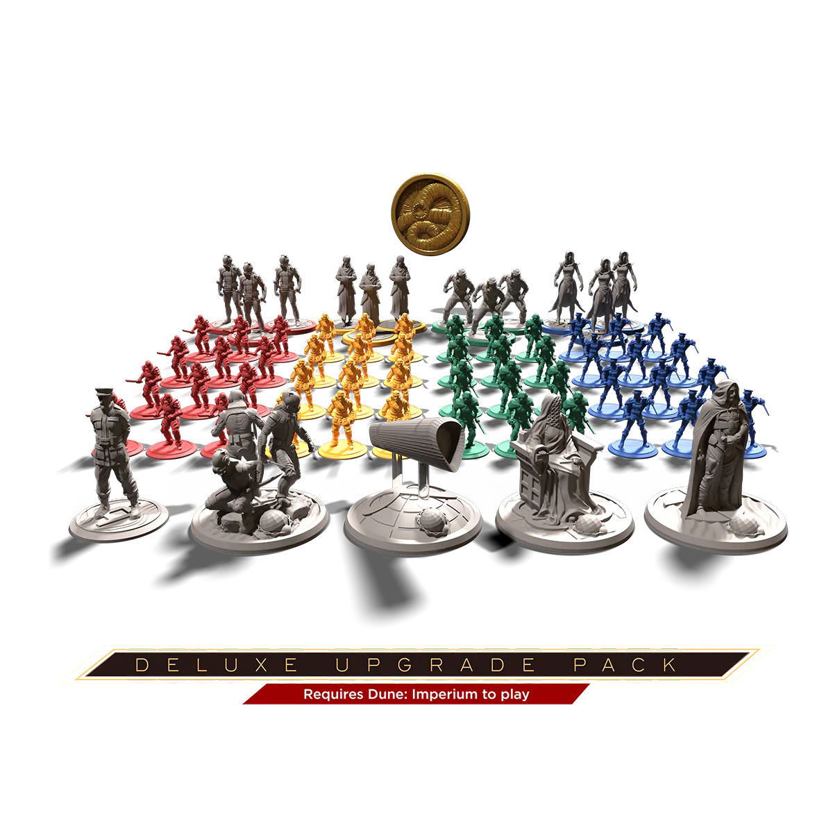 Wynieś swoją rozgrywkę na inny poziom, dzięki zestawowi figurek Dune Deluxe Upgrade! Ponad 60 figurek zamieni planszę w prawdziwie zamieszkałą planetę, a wielkie pudło pomieści wygodnie wszystkie komponenty gry (łącznie z kartami w koszulkach).