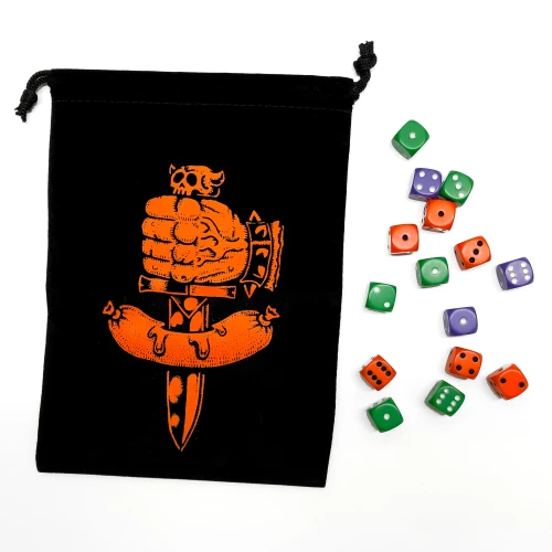 Hewn of luxurious blackest velvet, emblazoned with the mighty DUNGEON DEGENERATES logo & filled with fifteen 12mm Chessex dice (made in Denmark) that match the dice you get with your Dungeon Degenerates - Hand of Doom board game.