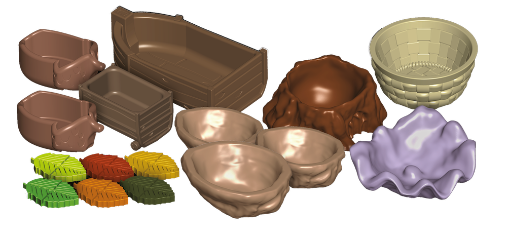 Uwielbiasz swoje rozgrywki w Everdell, ale wolisz, aby surowce nie toczyły się po całej planszy? Skorzystaj ze specjalnych pojemników, idealnie pasujących do znaczników dostępnych w grze! Dzięki nim jagody bezpiecznie wylądują w koszu, perły w muszli, kawałki żywicy w ściętym pniaku, a drewno w barce, spływającej w dół rzeki. Rozszerzenie Everdell: Piękniaste pojemniki zawiera też specjalne liście, które umożliwią utrzymywanie kart wydarzeń w pionie, dzięki czemu będą one lepiej widoczne podczas całej gry.