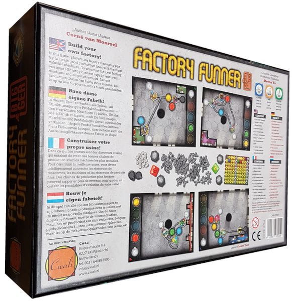 The second edition of this game — Factory Funner&Bigger — features the same gameplay as the original release, but with a deeper box, more connectors, and slightly different colors for better usability, and without the "jump" machine as it had a high luck factor and created rules difficulty during play.
