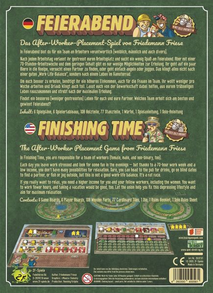 Welcome to Feierabend, a.k.a. Finishing Time, the after-worker placement game for 1-6 players.